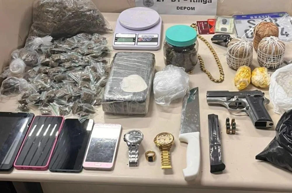 Na noite de sexta-feira (10), a Polícia Militar apreendeu uma arma de fogo, artefatos explosivos e drogas durante uma ação na localidade do Jardim Talismã, no bairro de Itinga, em Lauro de Freitas.