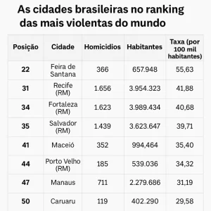 O município baiano de Feira de Santana lidera o ranking brasileiro, com taxa de 55,63 homicídios por 100 mil habitantes, ocupando a 22ª posição no ranking global. A região metropolitana de Recife aparece em seguida, com taxa de 41,88 homicídios por 100 mil habitantes, ficando na 31ª colocação.