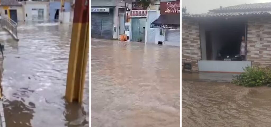 Ruas e casas foram invadidas pela água após forte temporal. A prefeitura decretou situação de emergência por 180 dias, e a Secretaria Municipal de Educação suspendeu as aulas por tempo indeterminado.