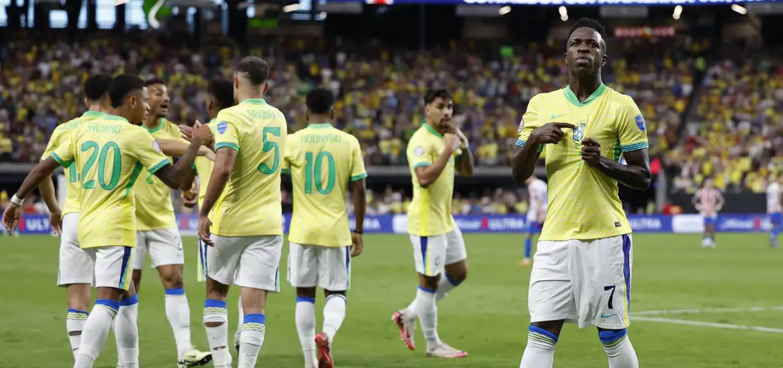 No jogo contra o Paraguai, a Seleção dominou os primeiros 45 minutos com pressão, velocidade e insistência. Com 46.316 torcedores na Neo Química Arena, o Brasil impôs uma marcação alta e dificultou a saída de bola adversária. Logo aos 11 minutos, Vinicius Júnior teve uma boa chance de gol, mas isolou. Aos 27′, Matheus Cunha perdeu uma oportunidade clara, cabeceando torto após cruzamento de Martinelli.