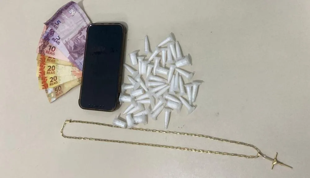 Durante a abordagem, os policiais encontraram com o homem duas sacolas plásticas contendo pinos e potes com substância branca análoga à cocaína, além de R$ 130 em dinheiro trocado, um aparelho celular iPhone e uma corrente dourada.
