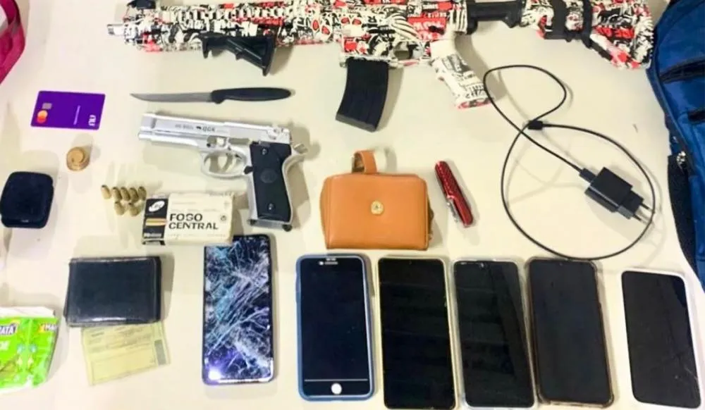 Com os envolvidos, os policiais apreenderam um simulacro de fuzil, um simulacro de pistola, sete munições de calibre 9mm, oito aparelhos celulares, um cartão bancário, facas e outros objetos de origem ilícita.